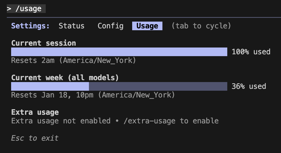 That wasn’t really good enough for me, and plus I knew there must be a better way. After all, the Claude Code tool itself can tell you your exact quota remaining, so we should be able to just reuse that for ourselves. I decided to try automating the built-in /usage slash command directly to get my usage data.